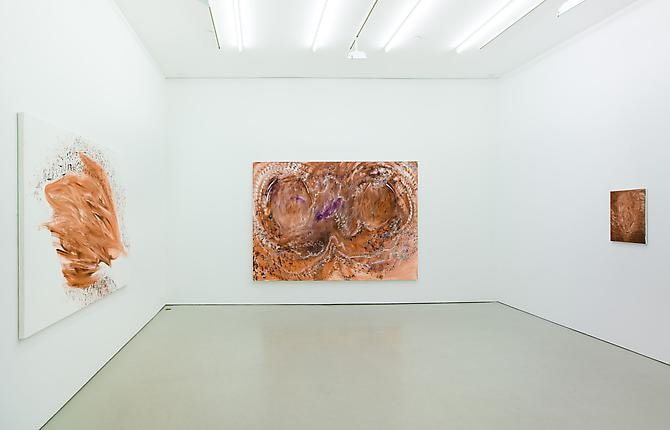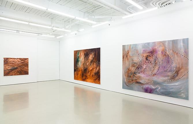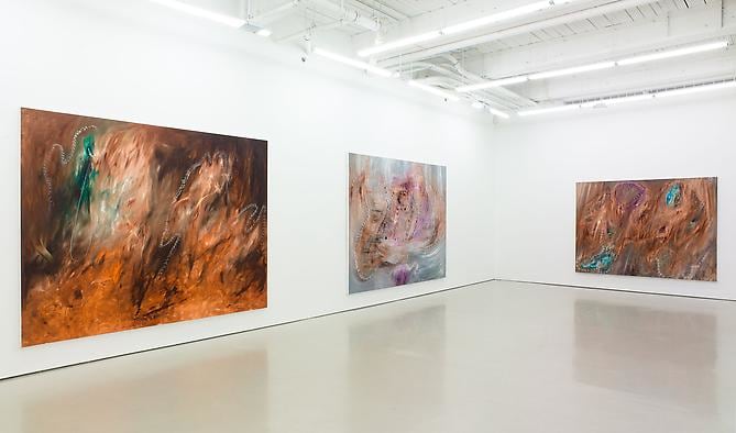 Autumn Buffalo is a series of sixteen paintings that Hesidence produced as a single volume through a focused and investigative period of painting. Each work embodies its own scale and presence, from small pictures of abstracted figures to vast atmospheric landscapes as large as 102 x 132 inches. The brushwork, sometimes frenzied and other times controlled, showcases a complex range of mark making that codes each painting with unique punctuation, prompting a vacillating flow of visual data. The title Autumn Buffalo hints both to the work’s chromatic hues of predominantly rust and brown with bursts of green, turquoise, and mauve, and also to the American bison, the largest extant land animal indigenous to the North American continent and the carrier of many signs native and modern, desolate and triumphant.