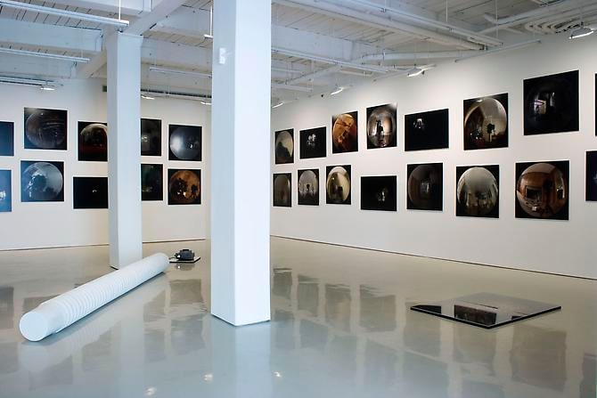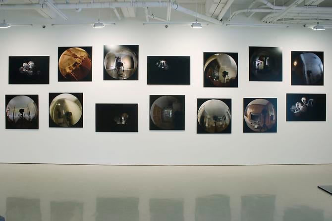 Relying on materials encountered in daily routine and capturing their reflections off of curved surfaces, Oliver redeploys prosaic objects to unveil new contexts and sites of meaning from a fish-eyed, almost surreal frame of reference. The images capture the artist at work among electrical cords, camera equipment, and scattered tools, contributing to the impression that through Oliver’s lens, one finds the artist in the midst of a private, uncensored event. Even in images where Oliver’s presence is absent, one can sense an implicit human trace through Oliver’s disquieting arrangement of axes, hammers, coal, and table lamps.