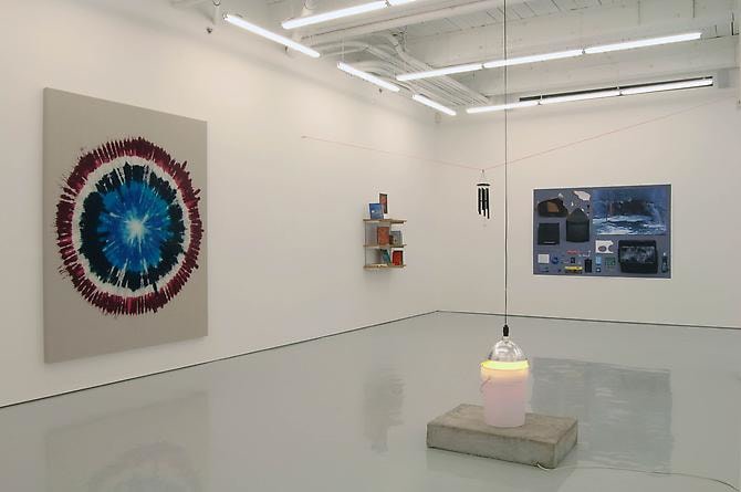 With a certain self-effacing attitude, the focus of the works is less on authorship and more on the relationships these works negotiate with the world as an endless supply of artifacts- both strange and familiar, opaque and symbolic (books in Carol Bove’s shelf arrangements, magazines in Anne Collier’s photograph, objects represented in isometric perspective in Daniel Lefcourt’s photographic riddle).  What was once the expression of individual aspiration by a decisive author is now diluted in works that question the possibility of originality itself (Michael Phelan’s tie dye commissioned target paintings, Michael Vahrenwald’s photographs of commercial therapeutic light boxes bearing new age brand names, or Sanford Biggers silent video of the reflection of a disco ball on the wall).