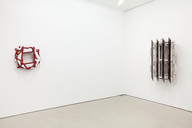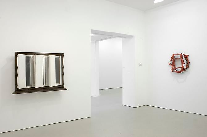 Featuring wall-based works, the exhibition represents a shift in scale from Rowe’s larger installations. While her previous sculptures addressed social space and dislocation, immersing the viewer in a quasi-cinematic experience, the new structures investigate the more personal form of the domestic mirror. In these wall pieces, she continues to employ strategies that allude to the space of architectural models, but the scale and material invite a one-to-one relationship with the viewer. The mirror's surface and frame are inverted, creating complex layers in which reflections are oblique or obscured. The hybridity of these constructions suggest multiple interpretations. A white textured wallpaper completely covers one of the gallery walls, adding a subtle complement to the exhibition.