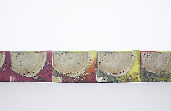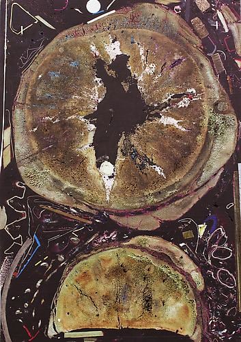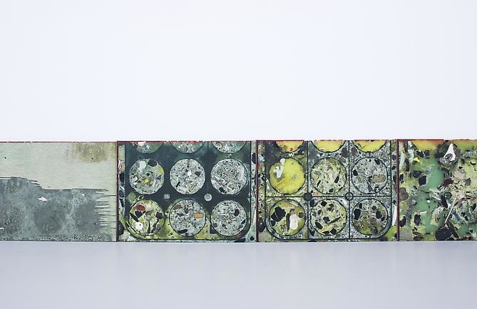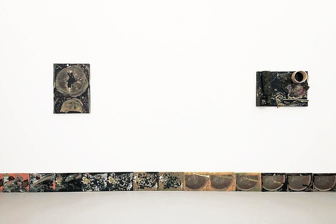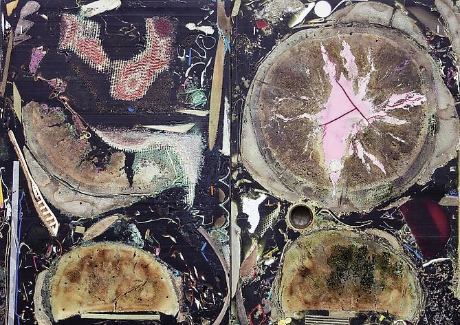New patterns, both abstract and social, emerge upon viewing his terrestrial compositions, hinting at the collective history of objects once accumulated, purchased, or consumed. In collecting his materials, the artist mines the natural world as well as human habitats, relationships, and circumstances. The aggregate matter, not wholly legible, allows the viewer to only glimpse the familiar—a piece of paper, coin, bark from a tree—activating our tendency towards personal investigation and narrative.