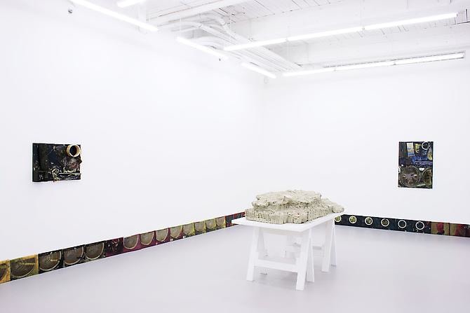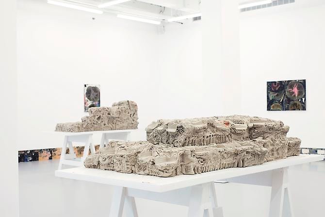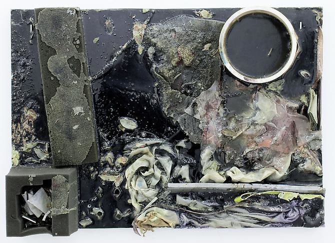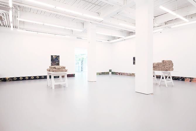 D’Amelio Gallery is pleased to present a solo exhibition with Los Angeles-based artist Jedediah Caesar. In Caesar’s sculptures, disparate found materials—both organic and inorganic—are amassed as one in a range of sculptural forms like resin and clay. His bricks, panels, and accumulations are composed of objects, permanently suspended in solid, dense space and often obscured by dirt, dust, pigment, and a powerful cutting process. Caesar’s multilayered medium, like a sealant, preserves fragments in both temporal and spatial dimensions, acting as an organizing principle, imposing boundaries and order.