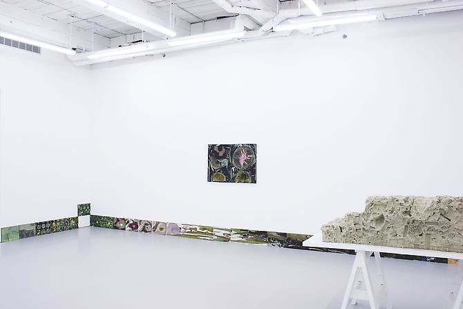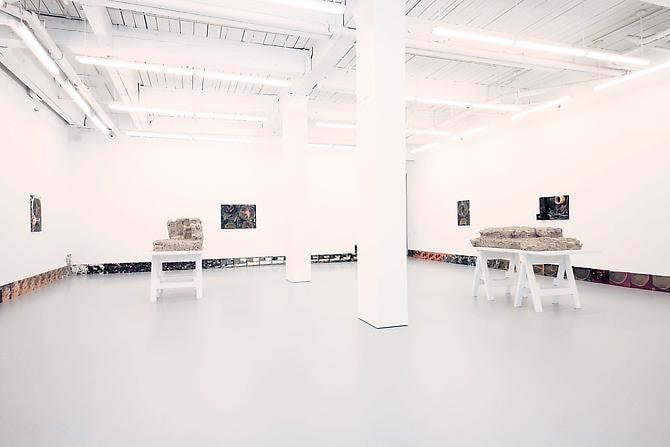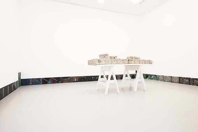 A film plays continuously in the bottom margins of the space. It follows a trip from the city to the desert and back again.