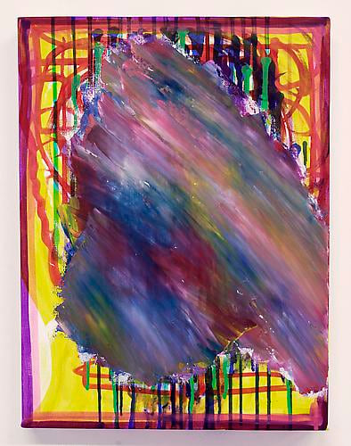 The act of painting for Greenbaum is performative: it records the decision making dictated by the materials. She shifts between surface and ground to activate each composition. A densely clustered field of magic marker spirals is obliterated by a spill of ink or a pour of water. The surfaces are transparent, like a veil or a gel, on which the artist builds solid and structured forms. This tension between soluble and insoluble is evident throughout the series as she combines drawing materials like marker, ink, ballpoint pen with oil, watercolor, and acrylic paint. The scale of these canvases emphasizes the immediacy inherent in Greenbaum’s work. The works are alive in their off-handedness. Far from being precious, the paintings express the exuberance of making art and life in the studio.