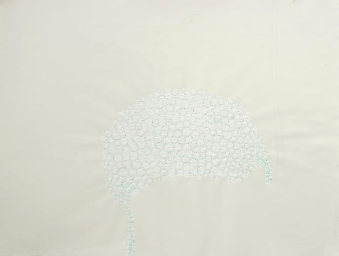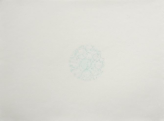 The tension between the decorative and the anatomical has been a constant in John Morris’ works and is heightened in these pieces. Associations with microorganisms lend themselves easily: systems of repetitive shapes grow organically over the page, their fluid combination evokes symbiotic relationships between organisms, life cycles carried by the fusion of two elements. The marks are suggestive of cellular structure. Miniature swirls, concentric fine circles or ellipses, pendant drop shapes, crown formation of globules of acrylic gel proliferate into complex compositions and result in elaborate shapes that seem caught in stages of expansion. As the distinctions between animals and plants were not clearly defined in nature’s early stages of development, the compositions call to both classifications, as if John Morris was studying the structures and reproductive mechanisms of primitive flora and fauna.