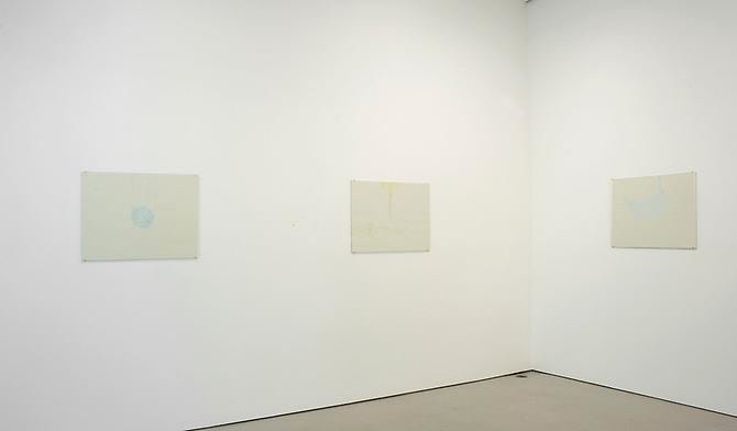 John Morris is known primarily for creating delicate and compositionally complex works on paper that feature built up surfaces and repetitive forms, reflecting his fascination with systems and patterns. In this series of eight works dated 2002, he explores a larger scale and introduces a subtle use of color: pale blue, purple, yellow and red play against faint marks of ink or graphite. In certain works, droplets of translucent or white acrylic gel create small reliefs and reveal a second composition over the image.
