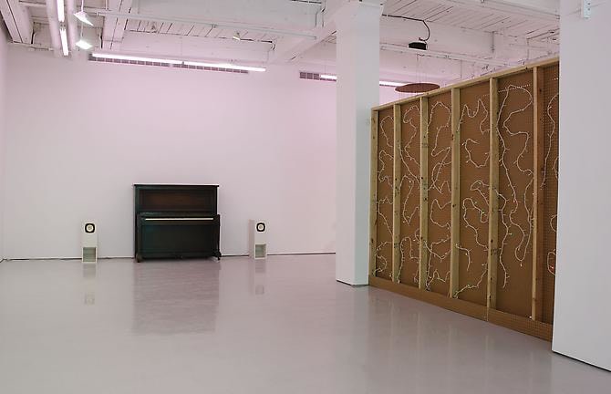Sheldon has modified and amplified an upright piano to play notes at varying intervals, the reverberation of each tone is altered by the next, creating ongoing poly-rhythmic compositions. Based on a simple predetermined order, minute variations in the mechanism of the piano interact with the properties of amplification to create a continuously evolving and unpredictable soundscape. Other sculptural works, such as a fountain encased in a plywood box and a set of mechanized wind chimes made out of metal fence caps, express how a captivating aesthetic experience can be generated through prosaic means.