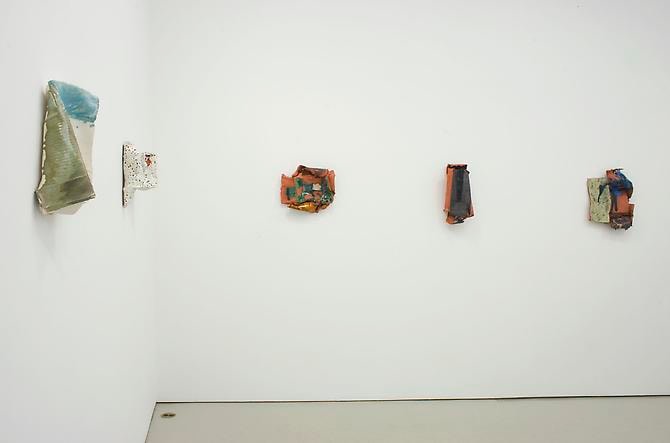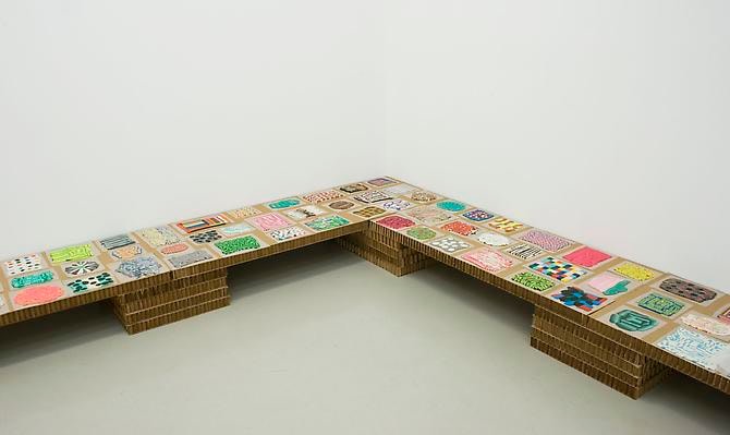 Partially inspired by Eva Hesse’s tabletop ‘studioworks,’ a mélange of experimental works discovered in her studio posthumously, Polly Apfelbaum’s miniature samplers invoke a practice in which process and material are primary to object and abstraction explodes automatically from an exuberant dialogue between color and pattern. Apfelbaum’s nickname for these tactile works, “feelies,” pays homage to a trio of multimedia references: work by the same name of American potter Rose Cabat, the brightly colored canvases of Color Field painter Paul Feeley and the 1980’s underground rock band The Feelies. Unfired and still malleable, the polymer and plasticine clay panels present a kaleidoscopic landscape outlining a narrative built of compositional impulse. Uneven checkerboards, latticed squares, strident lines and multicolored spirals invite open-ended associations and defy precise categorization. Presented in a grid, the works both complement and oppose each other as irregular edges, right angles neighboring undulating arches, create surprises in negative space.