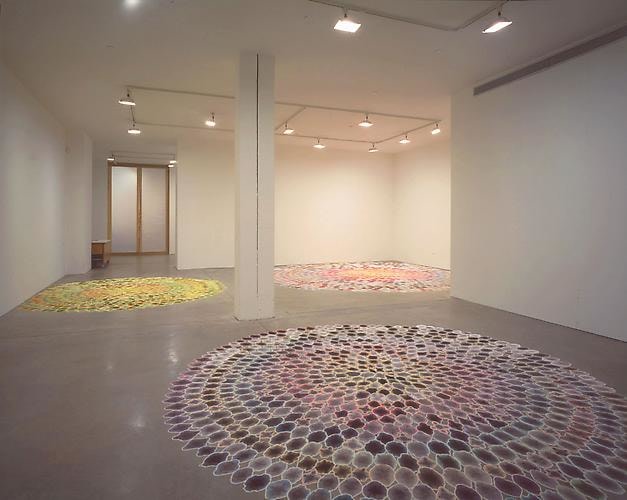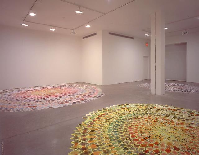 Powerpuff is an installation of three new large-scale floor pieces by Polly Apfelbaum.  Each of the works is constructed from hundreds of diamond-shaped pieces of dyed velvet that whirl out from a center to form a circular pool of color.  In contrast to the flowing and organic organization of Apfelbaum’s previous works, the rigorous internal logic in these pieces carries a centrifugal force that animates the soft, fluid material.  The Powerpuff pieces bounce against the gallery’s architectural elements, activating the space with their dense energy.