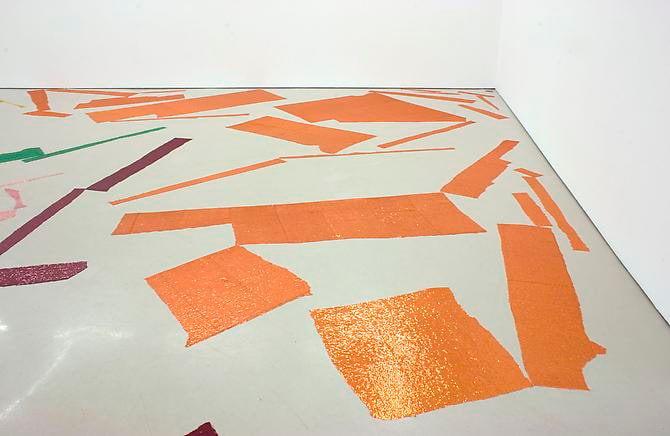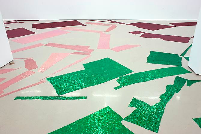 Amplified colors and abstract forms enable painting and sculpture to merge in an open environment. Apfelbaum cuts her material, creating lines in space that circumscribe the viewer’s path through reflective configurations of glittery pink, green, red and gold. The simplicity of her hard-edged forms illuminates the visual significance of the negative space that separates them. What the artist calls “automatic abstraction” emerges from the interplay between presence, void and color. As in much of her past work, the show’s palette is a found system of color, this time being loosely based on a group of slides Apfelbaum found at Spitalfields Market in London. The sequined fabric both relates to Apfelbaum’s interest in pop culture and ordinary, cheap material, while it also distills formal qualities as the individual disk-shaped beads reflect and refract light, creating endless visual possibilities for the viewer.