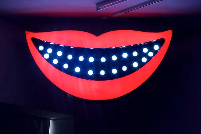 The sculpture, similarly titled “Cheshire,” functions as an outrageous/shop street sign. A broad smile with big red lips and teeth so shiny that they are made of working light bulbs.